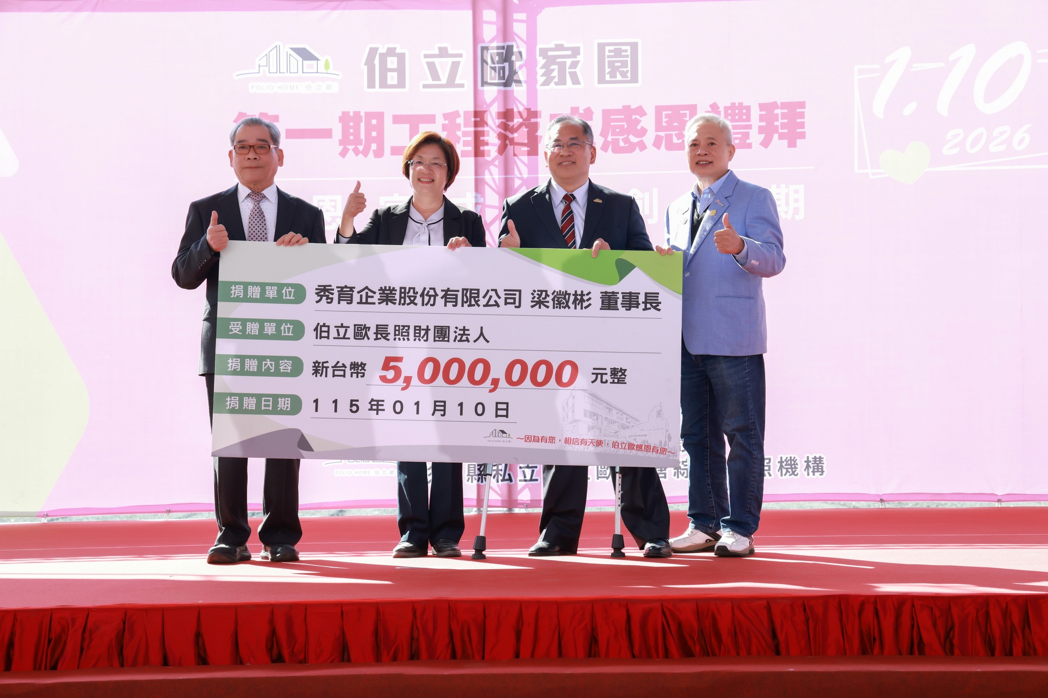 以及今日多位率先響應的先進們,包含秀育企業梁徽彬董事長捐贈500萬、藝術家卓麗秋老師捐贈100萬、帝寶工業股份有限公司捐贈30萬元、新欣企業陳俞蓁捐贈10萬元、信德慈善會捐贈10萬元、樂麥咖啡認養10萬元的護理床、世佳工業施議淦總經理捐贈10萬元等等。