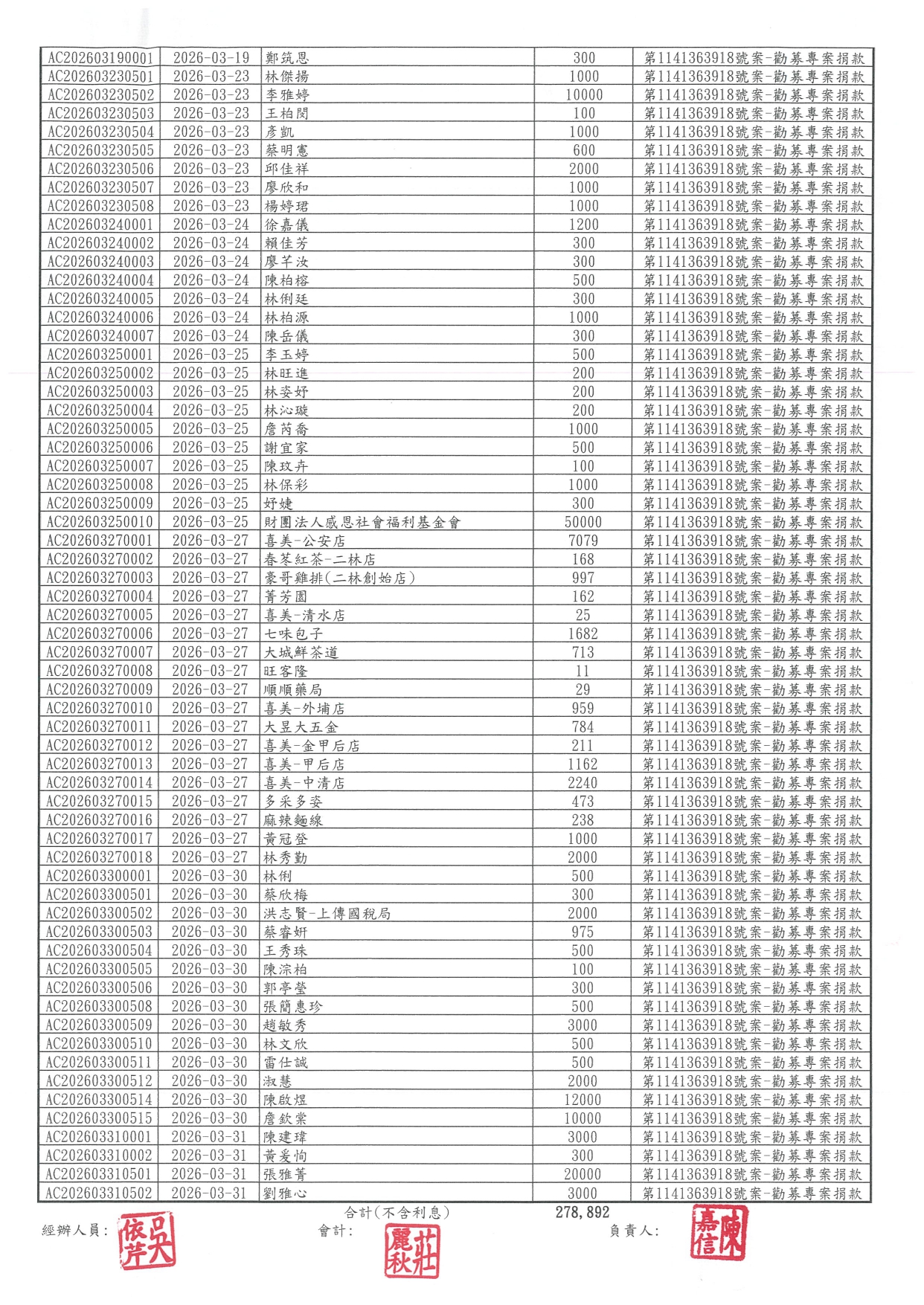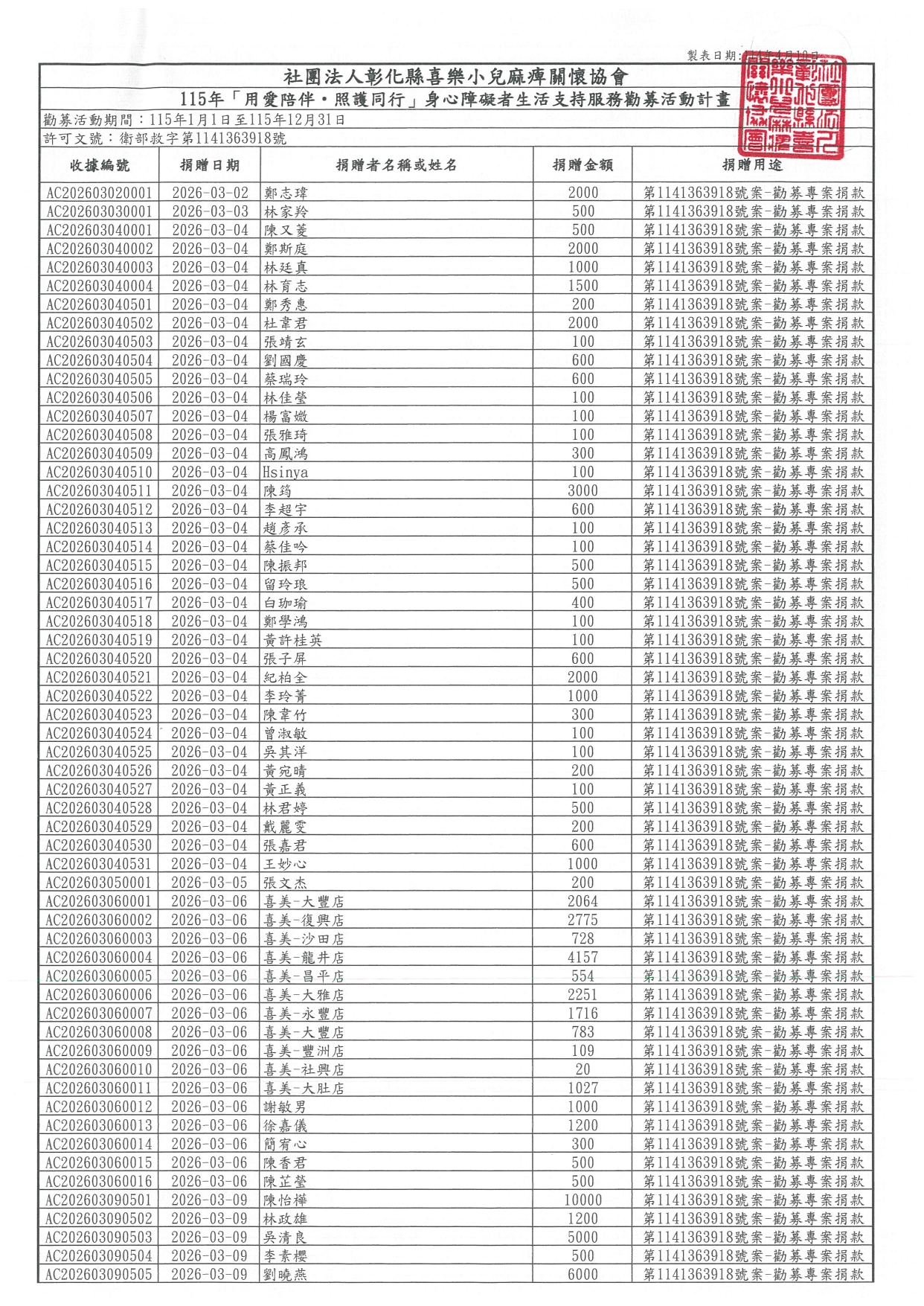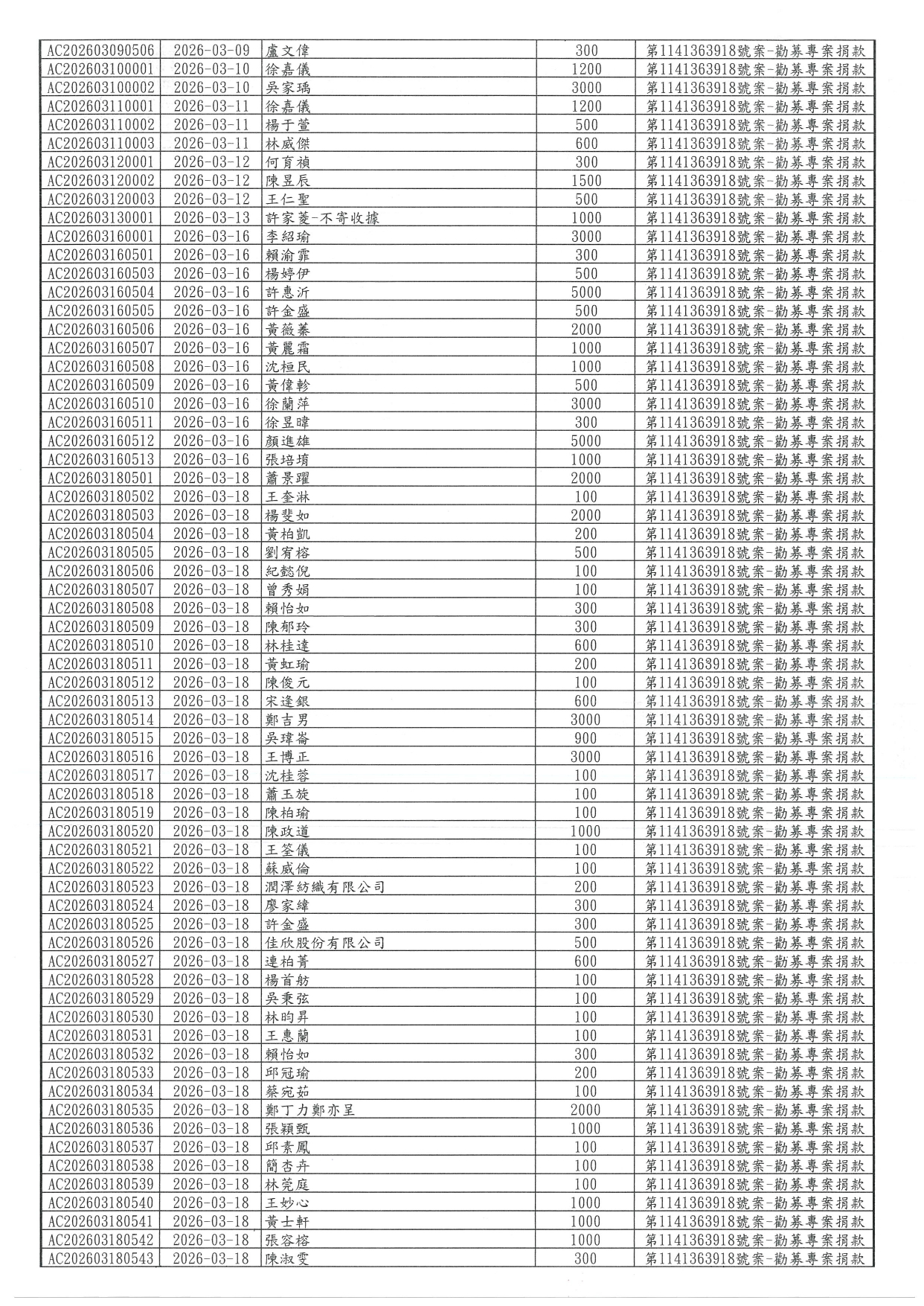 115年「用愛陪伴‧照護同行」身心障礙者生活支持服務勸募活動計畫-3月份捐款明細